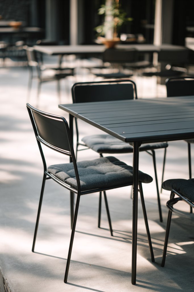 Visualize a spacious patio with low-profile metal chairs and a matching rectangular table, all in matte black or brushed aluminum. The surface is kept free of excessive decorations, with a simple outdoor rug anchoring the seating area. The furniture’s sleek silhouette contrasts beautifully with a backdrop of lush greenery or minimalist architecture. Ambient lighting is integrated into the design, casting a subtle glow that highlights the clean aesthetic. It’s an environment that radiates calm and order.