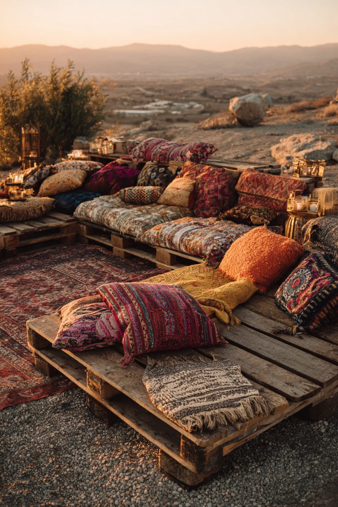 Visualize a collection of weathered wooden pallets arranged in a semi-circular formation, topped with plush, patterned floor pillows. Bright, textured throws are tossed casually over the pillows, adding layers of comfort and color. An outdoor rug with intricate patterns anchors the seating area, while lanterns or string lights hang overhead for ambiance. The scene is vibrant, inviting, and full of personality—a perfect spot for lounging with friends or enjoying a lazy weekend. The natural wood textures combined with colorful textiles create a boho paradise.