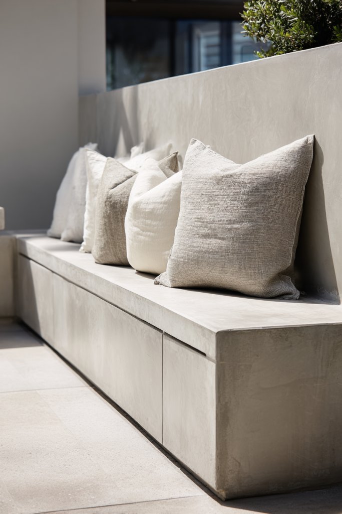 Select cushions in weatherproof fabrics to withstand outdoor conditions, and rotate patterns or colors seasonally for variety. Incorporate built-in storage beneath the bench for extra functionality. For a softer look, add throw pillows with textured covers or fringe details. The bench can be extended or segmented to fit different patio sizes, and you can add a matching concrete table or planters nearby to create a cohesive look.