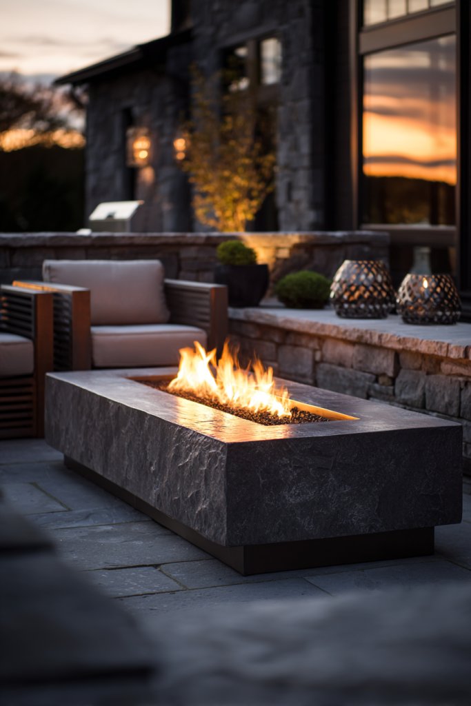 Picture a sleek, portable fire pit made of concrete, metal, or stone, surrounded by comfortable outdoor lounge chairs in weatherproof fabrics. The chairs are arranged in a circle or semi-circle, creating an inclusive space for conversation. Soft lighting, plush cushions, and warm throws make the scene cozy. The fire crackles gently, casting dancing shadows over the scene. It’s a perfect setup for cool nights, outdoor movie nights, or intimate chats under the stars.