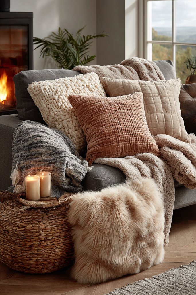 1. Layer Soft Textiles with Plush Throw Blankets and Cushions