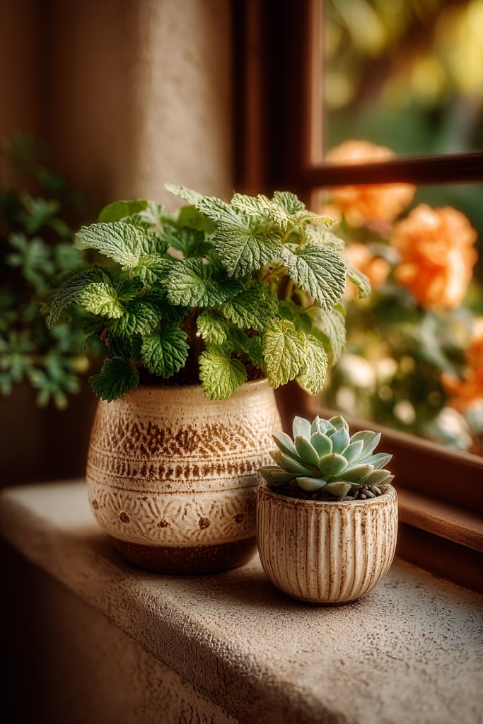 Picture a small, stylish ceramic pot with a low-maintenance succulent or a tiny air plant perched on a windowsill or shelf. The container could be matte black, textured concrete, or colorful ceramic—whatever matches your decor. These small pops of green add vibrancy, and their simple containers blend seamlessly into your aesthetic. The plants’ natural textures contrast beautifully with sleek furniture and neutral walls, adding a fresh, lively vibe.