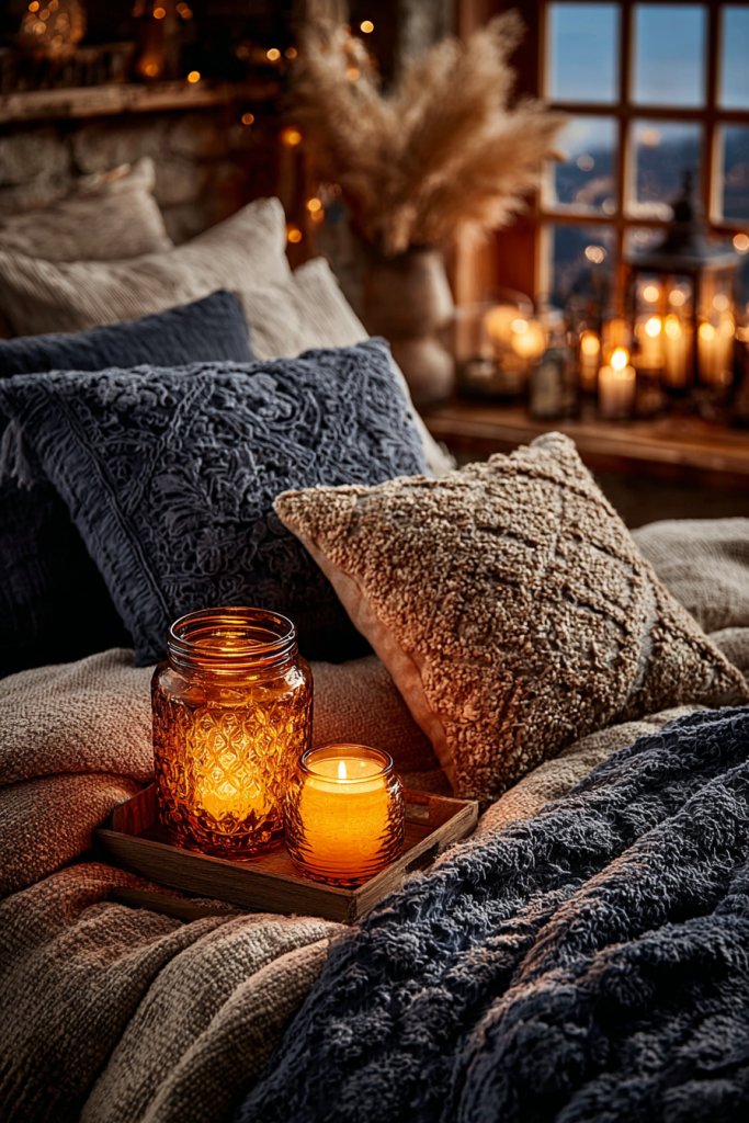 Picture a cluster of flameless LED candles in varying heights on a coffee table or shelf, their flickering glow mimicking real flames. Scented candles in decorative jars add a fragrant layer to the ambiance, making your space smell as cozy as it looks. The soft, golden light reflects off nearby surfaces, creating a calm, inviting environment. These candles turn any corner into a warm retreat.
