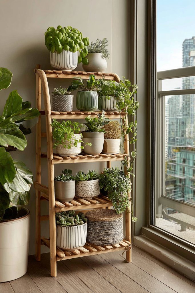 19. Use Compact Multi-Tiered Plant Stands for Vertical Greenery