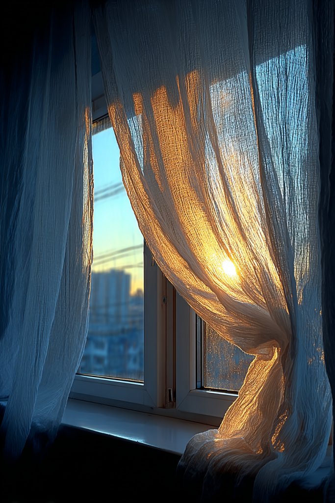 Visualize lightweight, flowing sheer curtains gently billowing in a breeze, filtering sunlight into a soft glow. They hang loosely from simple rods, softly framing your windows without overwhelming the room. During the day, they diffuse sunlight, creating a warm, inviting ambiance; at night, they offer privacy without feeling oppressive. The fabric’s transparency adds a layer of texture and movement that elevates your decor effortlessly.