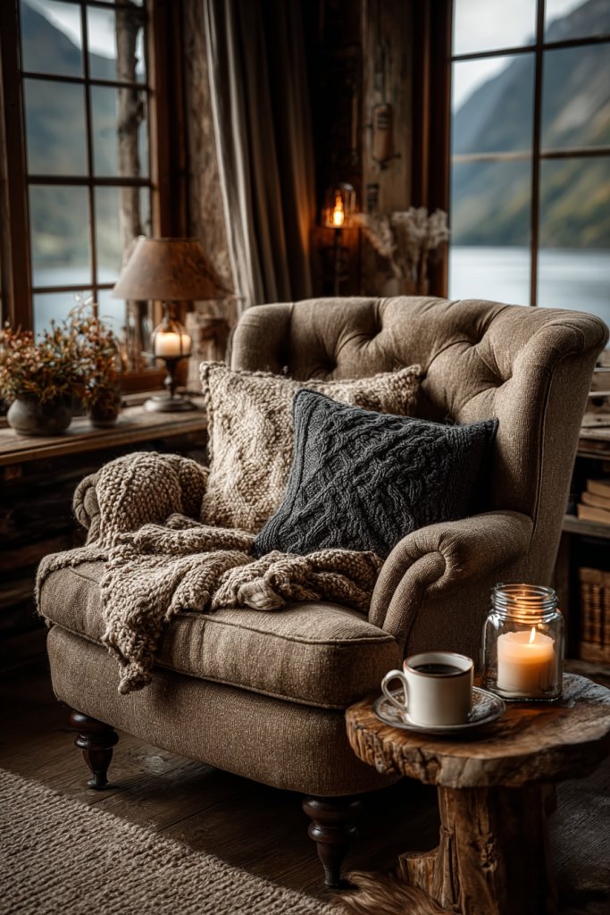 Picture a plush, inviting armchair nestled in a quiet corner, with a small side table holding a warm mug and a book. Soft textiles like a fuzzy throw drape over the chair, inviting you to sink in. Warm lighting from a nearby wall sconce or candle adds to the cozy vibe, making this corner your personal sanctuary. The space feels intentional yet effortless, perfect for escaping the hustle.