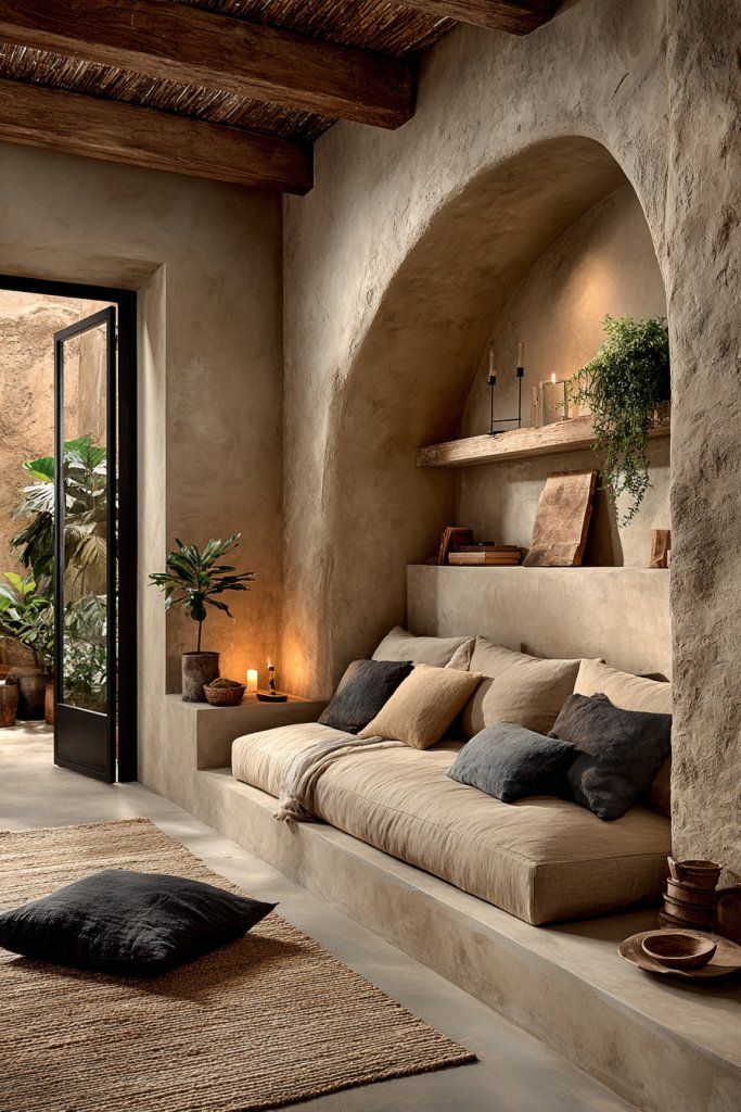 Add personal touches with textured wall hangings, fabric panels, or decorative shelving (without artwork). Change accent pillows and textiles to reflect seasonal color palettes, keeping the walls a calming constant. Incorporate natural materials like wood or rattan furniture to complement the warm neutral tones. Small decorative objects in warm metallics or ceramics can elevate the overall cozy aesthetic.