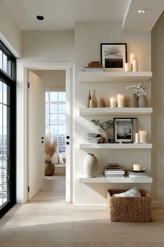 Imagine a set of slim, white floating shelves mounted above your desk or sofa, displaying curated collections of your favorite books, decorative objects, or small keepsakes. Their clean lines create a sense of openness, making the room feel less crowded. Light bounces off the smooth surfaces, highlighting your displays and adding visual interest. Floating shelves add both functionality and a modern touch to your decor.