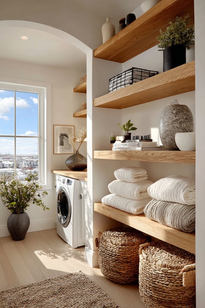 Imagine wall-mounted wooden shelves painted in soft neutral tones, neatly stacked with detergent bottles, folded towels, and baskets. The open design allows you to see everything at a glance, reducing clutter and frustration. Bright LED strip lights underneath the shelves cast a warm glow, highlighting your organized space. The shelves create a clean, airy vibe that makes the room feel larger and more inviting.