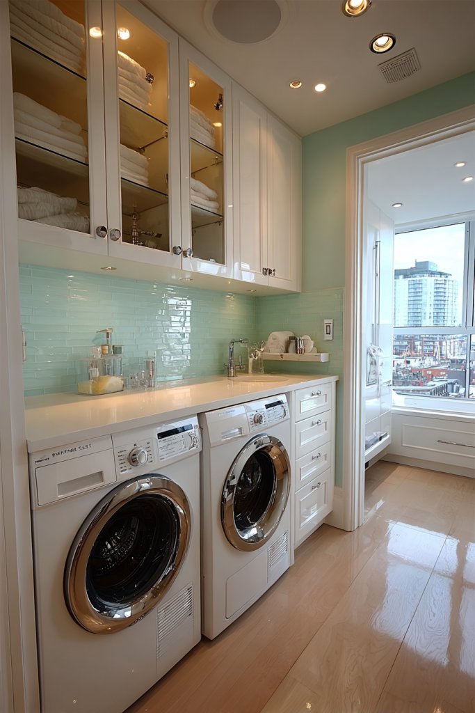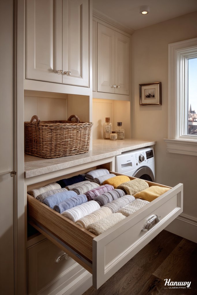 Decorate the cabinetry with hardware that complements your style—brushed nickel, matte black, or colorful handles. Install pull-out shelves or baskets inside for easy access to detergents and cleaning tools. Use labels or color-coded containers to streamline your laundry routine. Add a small fold-out table or extendable surface for extra work space during busy days.