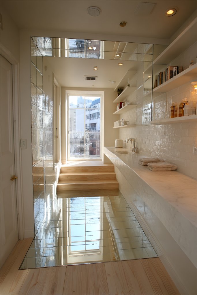 Envision a sleek, framed mirror mounted on the wall opposite the entrance. It reflects the entire room, doubling the visual depth and bouncing natural or artificial light around. The mirror’s surface is spotless, creating a clean, modern look that complements your decor. Small details like a textured frame or decorative edging add personality while enhancing the room’s perceived size.
