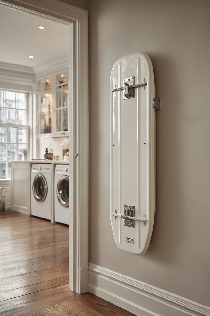Choose a fold-out board with a durable, heat-resistant surface—metal, wood, or composite. Opt for a design that matches your room’s style—sleek and modern or more traditional with decorative accents. Install with sturdy hinges and lock mechanisms to ensure safety and stability. For added convenience, include a small nearby shelf or hook for pressing accessories.