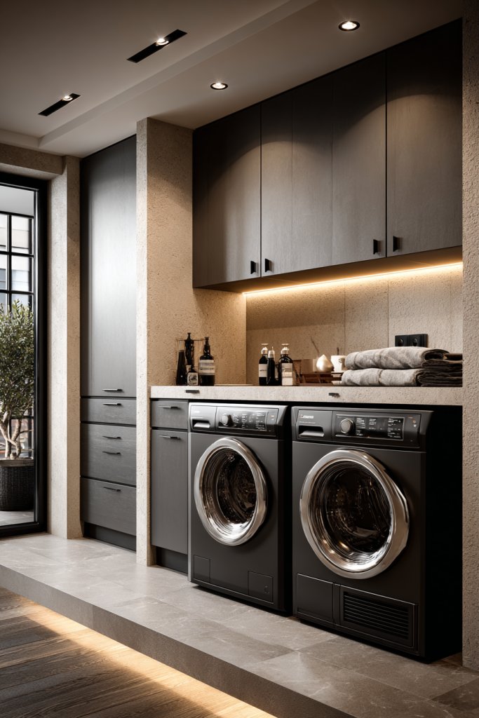 Envision a sleek all-in-one washer-dryer unit nestled into a custom cabinet with hidden compartments. A fold-over countertop extends from the unit, providing a workspace for folding or sorting. The entire setup maintains a minimalist aesthetic, with clean lines and integrated handles. The seamless design makes the room feel uncluttered and efficient, perfect for compact spaces.