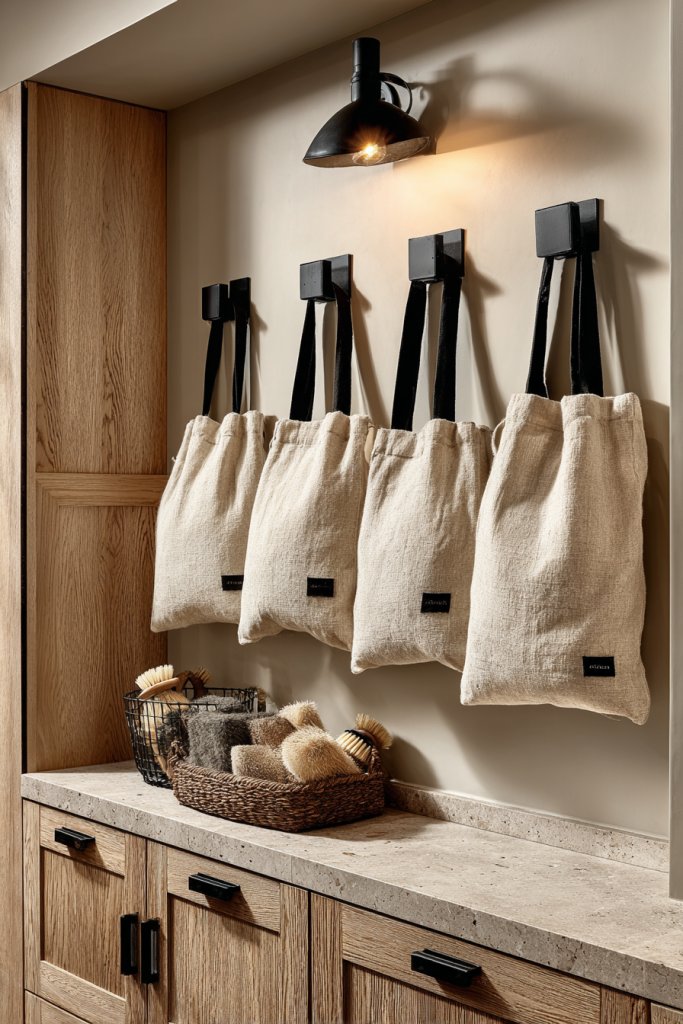 Imagine a sleek, wall-mounted unit with multiple compartments, made of wood or painted MDF, positioned near your laundry machines. The hampers hang vertically, with soft fabric liners or rigid bins in neutral shades. When filled, they look tidy and intentionally designed; when empty, they fold flat against the wall, almost invisible. The setup creates a streamlined, organized look that feels modern and calm.