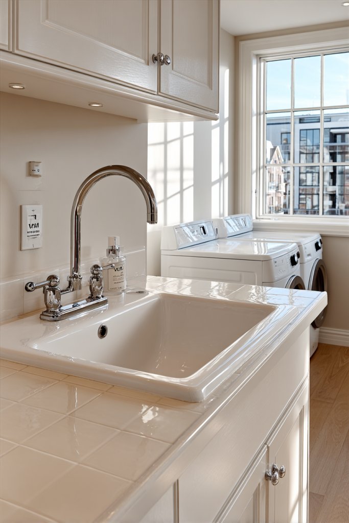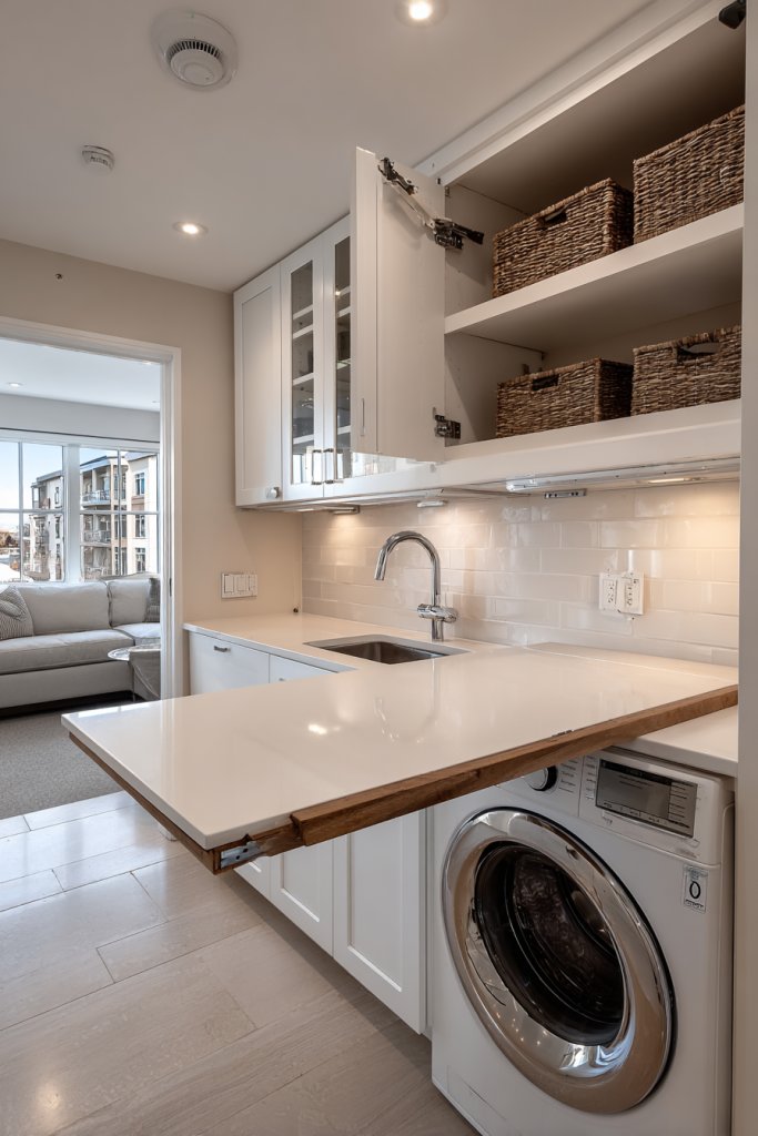 Imagine a compact, white ceramic or stainless steel sink mounted neatly into a corner or between cabinets. A small faucet with a flexible hose makes rinsing easy, while a compact basin minimizes space usage. The wall behind the sink is protected with a peel-and-stick backsplash or tiles, adding both style and practicality. The sink becomes a functional focal point that enhances your laundry routine.