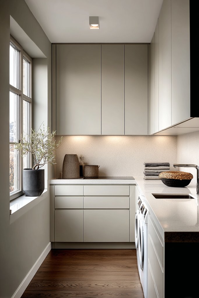 Neutral, handleless cabinets give your laundry room a modern, clutter-free look that’s easy to maintain. They boost the room’s brightness and create a sense of calm. With a sleek design and smart storage, laundry chores become more efficient and enjoyable—proof that small upgrades make a big difference.