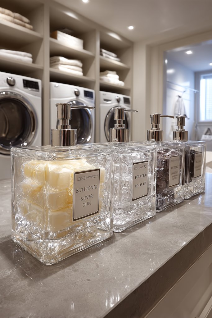 Messy bottles and containers cluttering your laundry space can make it feel chaotic and uninviting. Clear acrylic containers offer a modern, clean solution that keeps your supplies organized and visible. They’re perfect for reducing clutter and adding a sleek, uniform look to your laundry room.