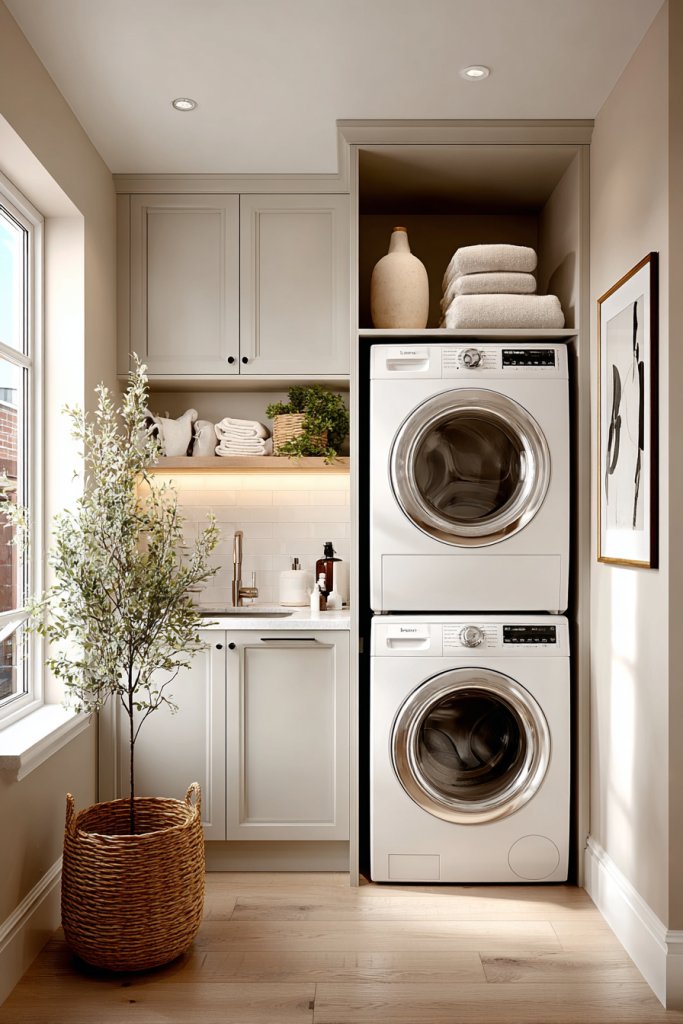 Visualize sleek, stacked laundry machines with a modern finish—stainless steel or matte black—fitting snugly into a custom-built cabinet. The front-loading doors are large and transparent, making it easy to see inside. The compact size frees up space for additional storage, a folding station, or even a small seating nook. The overall look is streamlined, minimal, and space-smart.
