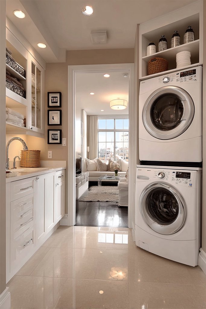 Choose combo units with modern finishes—matte black, white, or stainless steel—to match your decor. Incorporate a pull-out drying rack or a fold-down ironing board within the cabinetry for added versatility. Modular storage solutions can be integrated to keep detergents and accessories organized nearby. Adapt the layout to your specific space constraints, whether it’s a tight corner or a narrow wall.
