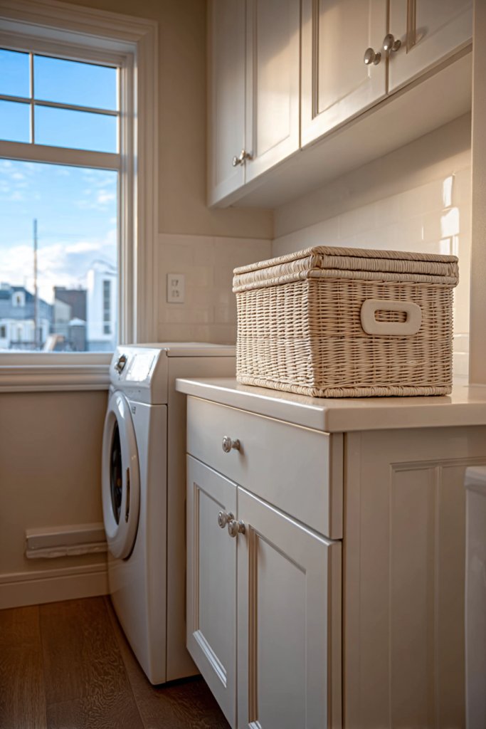 Cluttered laundry rooms can quickly turn into chaos, especially when supplies and clothes are tossed in haphazardly. Stylish baskets and bins offer a practical way to corral clutter while adding a decorative touch. They keep everything in its place and make your laundry space look intentional and tidy.