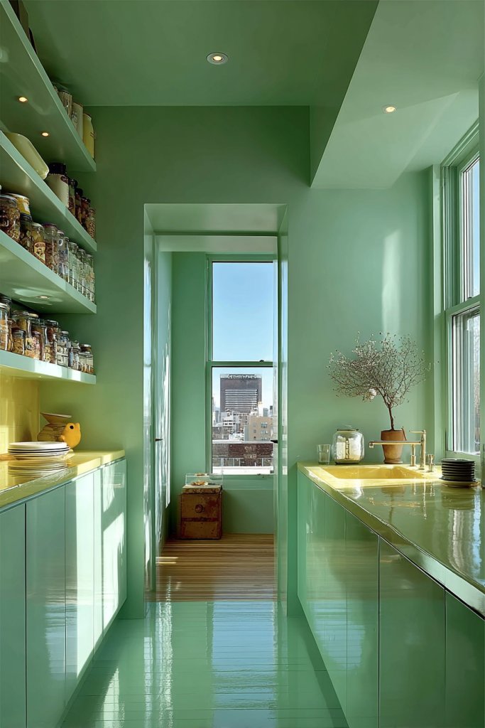 Picture walls painted in soft shades of ivory, blush, or pale blue, bouncing sunlight around the room. The painted surfaces are smooth and matte, reducing glare while enhancing the sense of space. Bright walls are complemented by minimalistic shelving and sleek appliances, creating a fresh, clean look. The room feels more expansive, almost like a breath of fresh air every time you step inside.
