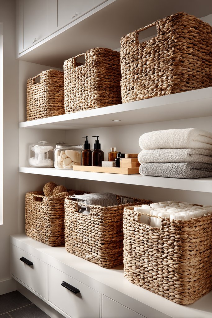Select durable, easy-to-clean baskets with handles for portability. Organize by purpose—one for laundry, another for accessories or cleaning tools. Place them on open shelves, inside cabinets, or on top of washer/dryer units. Label each container with tags or stickers for quick identification. Regularly sort and refresh contents to maintain order and style.