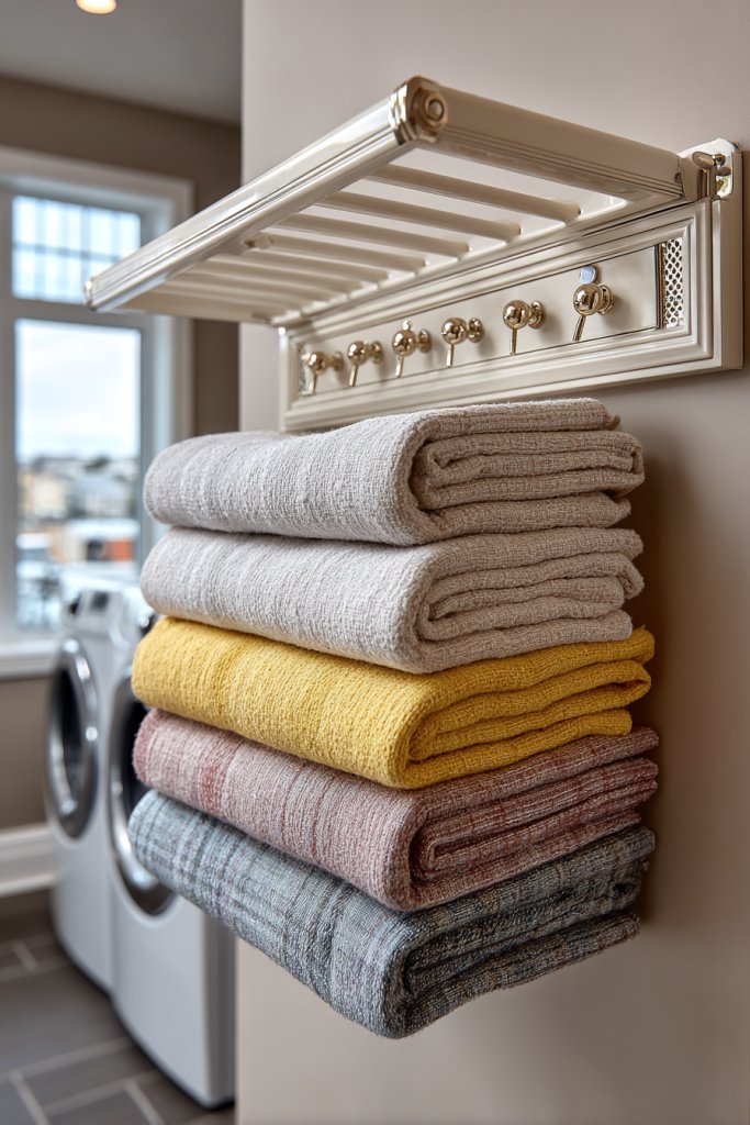 Imagine a retractable clothesline installed along the ceiling or a wall-mounted drying rack that folds flat when not in use. Delicate garments hang gently, swaying in the breeze, while neatly folded laundry waits nearby. The space stays organized, with everything having its place, and the room feels more open and functional. The drying area blends seamlessly into the room’s design while serving a critical purpose.