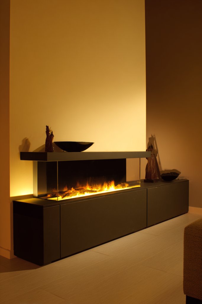 Imagine a sleek, modern console with a hidden electric fireplace embedded in the center. The flames flicker softly behind a tempered glass panel, creating a captivating focal point. The surrounding surface offers space for media devices or decor. Warm lighting from the fireplace adds a soothing glow, perfect for relaxing evenings.