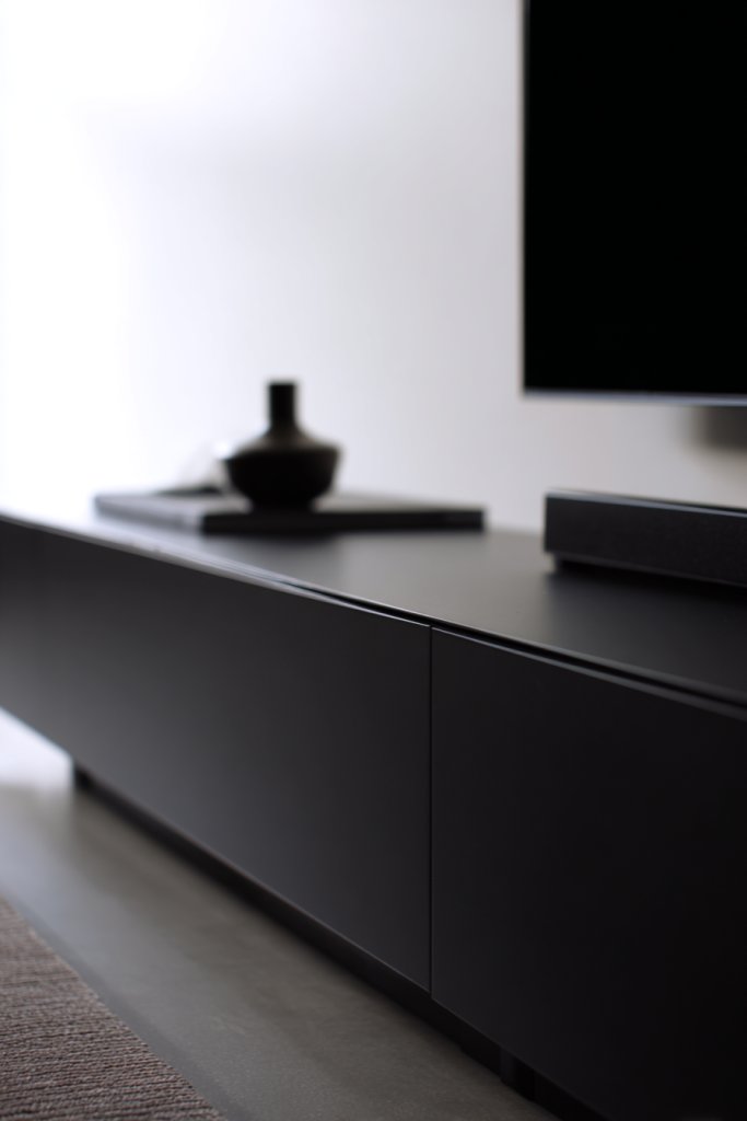 Picture a flat, wide unit with a matte or gloss finish, sitting close to the floor. The cabinets hide electronics and clutter, maintaining a minimalist look. Its slim profile makes the room feel more spacious and less crowded. The subtle design keeps your focus on the overall decor.