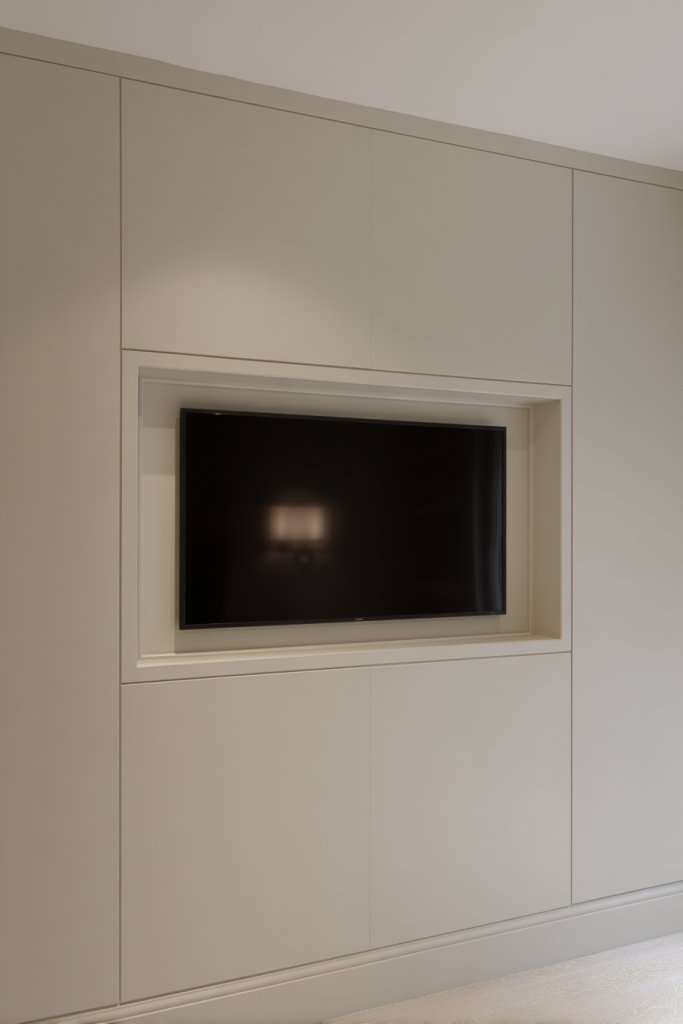 Visualize a recessed wall space with a flush-mounted TV, framed by custom cabinetry or wall panels. The niche offers space for hiding cables, gaming consoles, or decorative accents. The flush surface and hidden storage make the setup look clean and modern. Soft lighting can highlight the area without overwhelming the room.