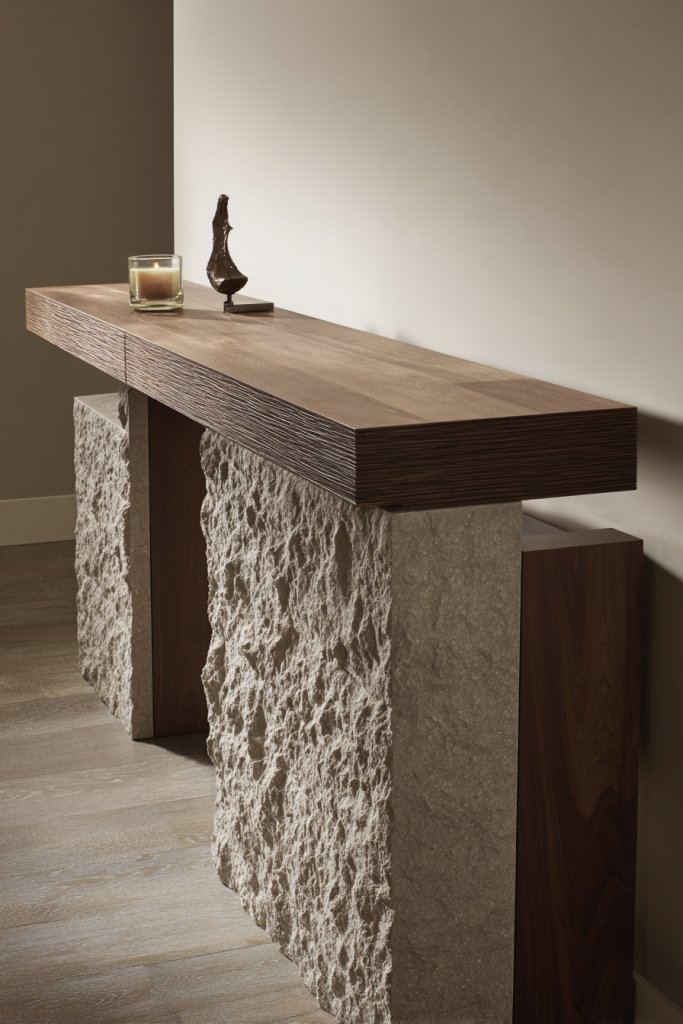 Picture a console with a sleek stone top paired with warm, natural wood cabinetry. The mix of textures creates visual interest and lends a sense of durability. The stone’s cool tones contrast beautifully with the warmth of wood, making each element stand out. It’s a refined look that feels both modern and timeless.