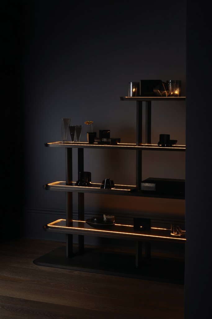 Choose cool white, warm yellow, or color-changing LEDs to match your mood or season. Incorporate open and closed storage to hide clutter, or add decorative elements like sculptural objects on the tiers. This style adapts well to contemporary, eclectic, or minimalist decor. Seasonal lighting effects can refresh the look throughout the year.