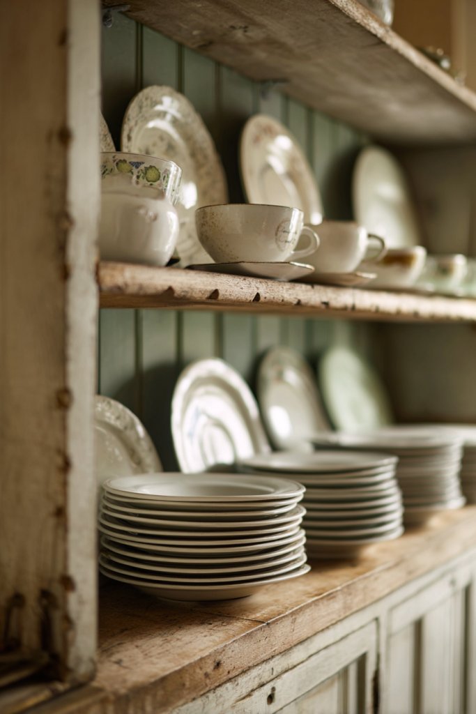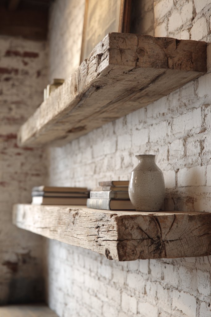 Imagine weathered, textured wood shelves mounted on soft pastel or muted walls. Vintage dishware with delicate patterns and mismatched cups sit proudly on the planks, catching the light with a gentle glow. The rough-hewn finish pairs beautifully with aged copper or brass accents for a layered, textured look. You can almost smell the wood’s history, adding depth to your space.