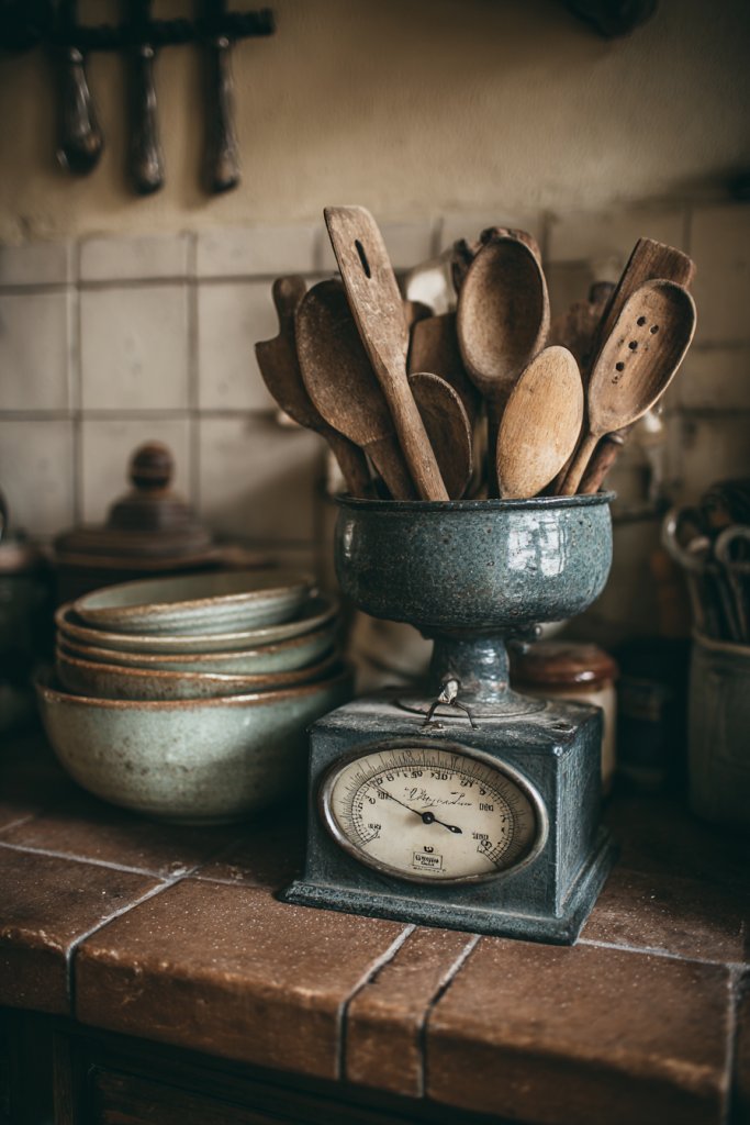Picture an old-fashioned cast-iron or chrome scale sitting on a countertop, with vintage glass or ceramic bowls. Nearby, a metal or wooden utensil holder contains spatulas, whisks, and wooden spoons with patinaed handles. The combination of aged metal, ceramic, and wood creates warmth and texture. It’s a functional display that doubles as decor, evoking a cozy, nostalgic vibe.
