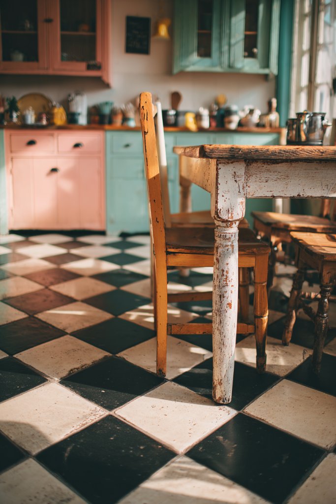 Imagine a black-and-white checkered floor stretching under weathered wooden cabinets. The glossy surface reflects light, making the room feel lively and expansive. Alternatively, striped tiles in bold colors or muted pastels can create a lively, dynamic pattern. The geometric design adds depth and movement, drawing the eye across the room and anchoring your vintage theme.