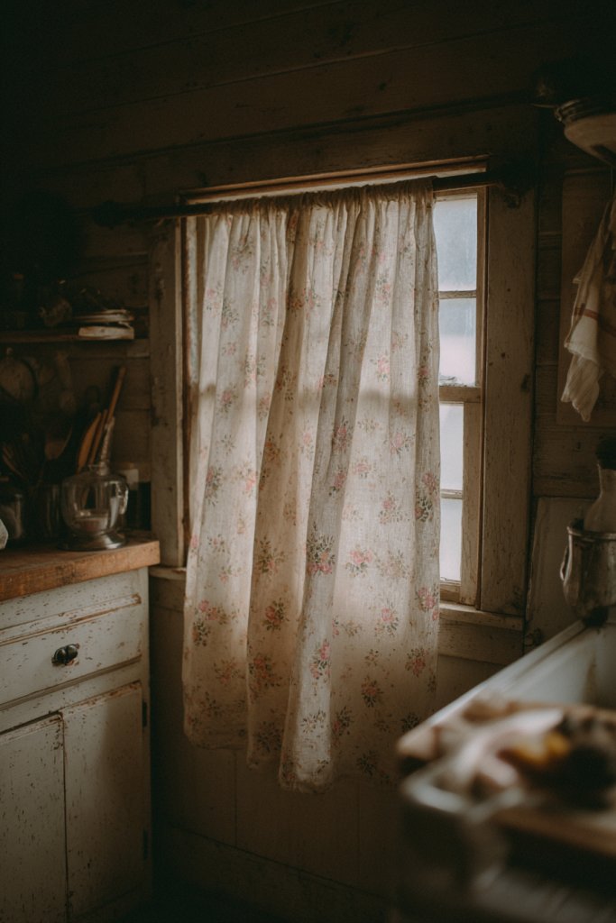 Picture floral or gingham fabric curtains draped in an apron style over your sink or under the window. The fabric’s textures and patterns evoke rustic kitchens or cottage charm. Gathered with vintage-inspired ties or ribbons, they create a relaxed, inviting atmosphere. When pulled aside, they reveal storage or plumbing, blending function with style.