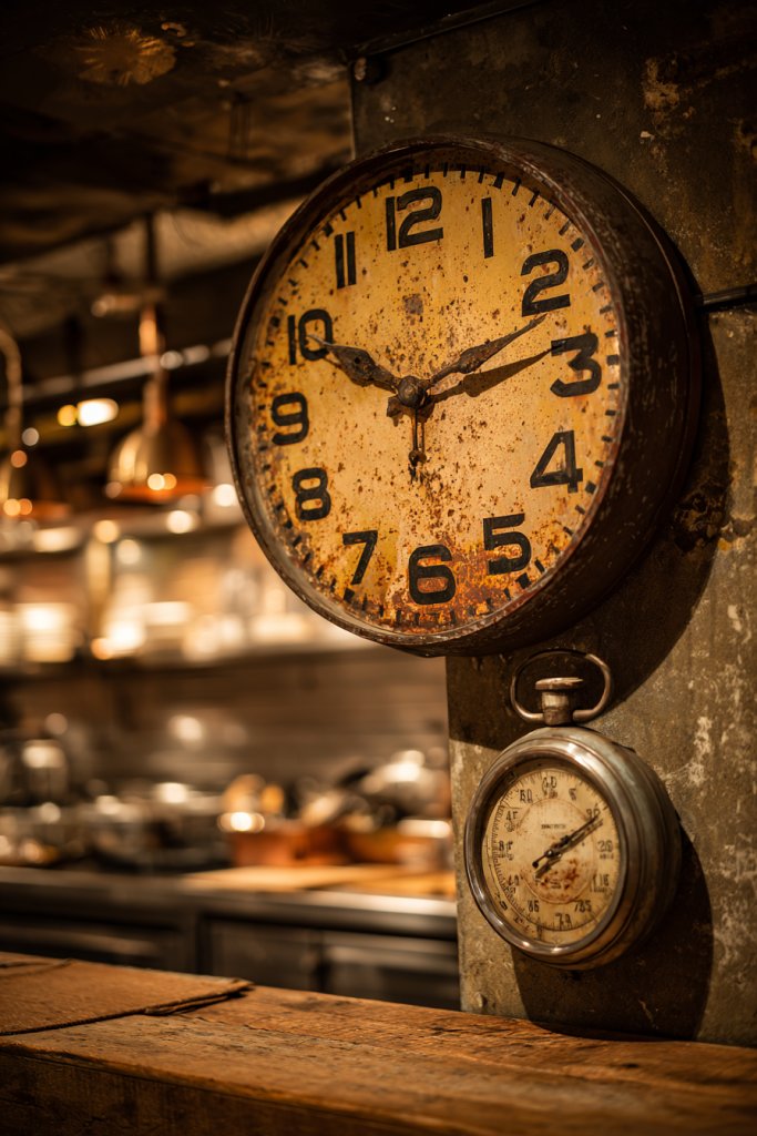 Select a clock with a vintage or distressed finish suitable for kitchen environments. Mount securely at eye level for easy viewing. Consider battery-powered clocks for convenience, but mechanical timers add authenticity. Place near your cooking zone for practicality. Regularly clean and check the mechanisms for accuracy and longevity.