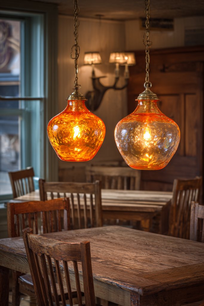 15. Nostalgic Glass Pendant Lights over the Dining Area