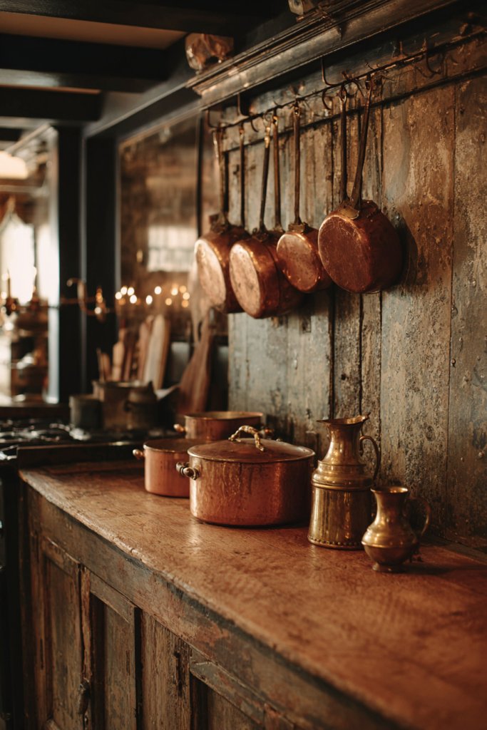 Use copper or brass hardware on cabinets and drawers for an instant vintage upgrade. Incorporate them into lighting fixtures, such as pendant lights or sconces. Display aged pots, pans, or decorative accents on open shelves or hanging racks. Mix with distressed wood or stone for a layered, textured look. Seasonal touches like copper-colored accessories or brass candleholders can refresh the style.