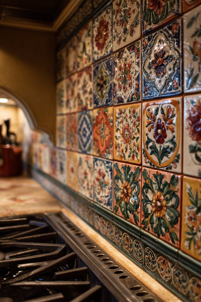 Imagine intricate floral or traditional motifs painted on individual tiles, arranged in a pattern that captures the eye. The textured brushstrokes and vibrant colors evoke vintage craftsmanship, reminiscent of European or Mediterranean decor. The tiles’ irregularities and handwork add charm, making the kitchen feel lived-in and artistic. The overall effect is a warm, inviting space full of character.