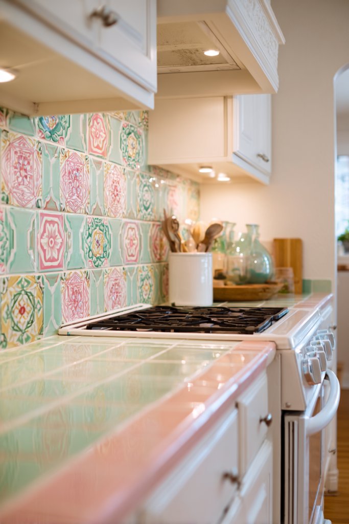 Choose tiles in pastel shades for a soft, vintage look or go bold with bright reds and turquoise for a more playful feel. Mixing patterns can also add depth, as long as the color palette stays cohesive. For small kitchens, a narrow strip of patterned tile as a backsplash suffices; larger spaces can handle full wall coverage. Seasonal accents like faux fruit or vintage signs complement the retro vibe.