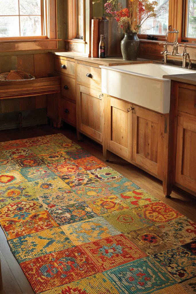 Picture a woven, patterned rug with geometric or floral motifs in faded hues or bold colors. The soft fibers invite you to stand longer while working or chatting. Vintage motifs like paisley, checks, or intricate borders evoke a charming, old-world feel. Place it in front of the sink, stove, or under a farmhouse table for maximum impact.