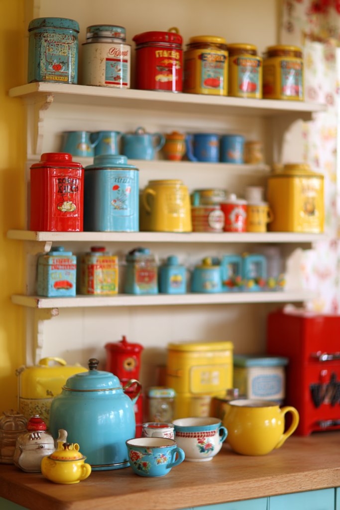 Mix and match different vintage brands and colors for an eclectic look. Incorporate themed sets—like baking or coffee—to create a cohesive story. Use small trays, baskets, or stands to display and organize. Seasonal or holiday-themed accessories keep the space fresh and playful. Pair with vintage linens or handmade textiles for extra charm.