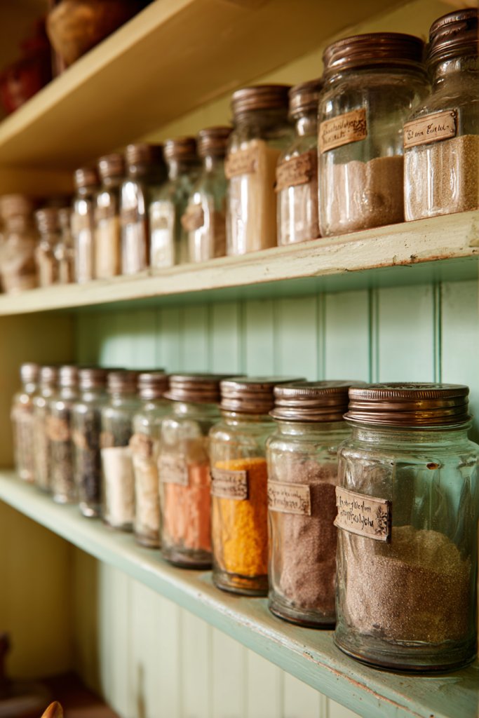 Choose jars in various sizes to accommodate different ingredients. Use chalkboard labels or handwritten tags for a personalized touch. Mix in some vintage metal canisters or wooden scoops for variety. You can also display jars on open shelving, inside glass-front cabinets, or as part of a decorative countertop display. Seasonal items like holiday cookies or spices can be stored in special jars for festive charm.