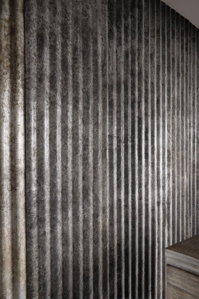Visualize panels with deep, parallel ridges running across the wall, finished in matte or brushed metal. The textured surface creates striking shadows and highlights, emphasizing the industrial aesthetic. The metallic sheen catches light, adding a sense of movement and energy. Combined with exposed pipes or reclaimed wood, it creates a space full of character.
