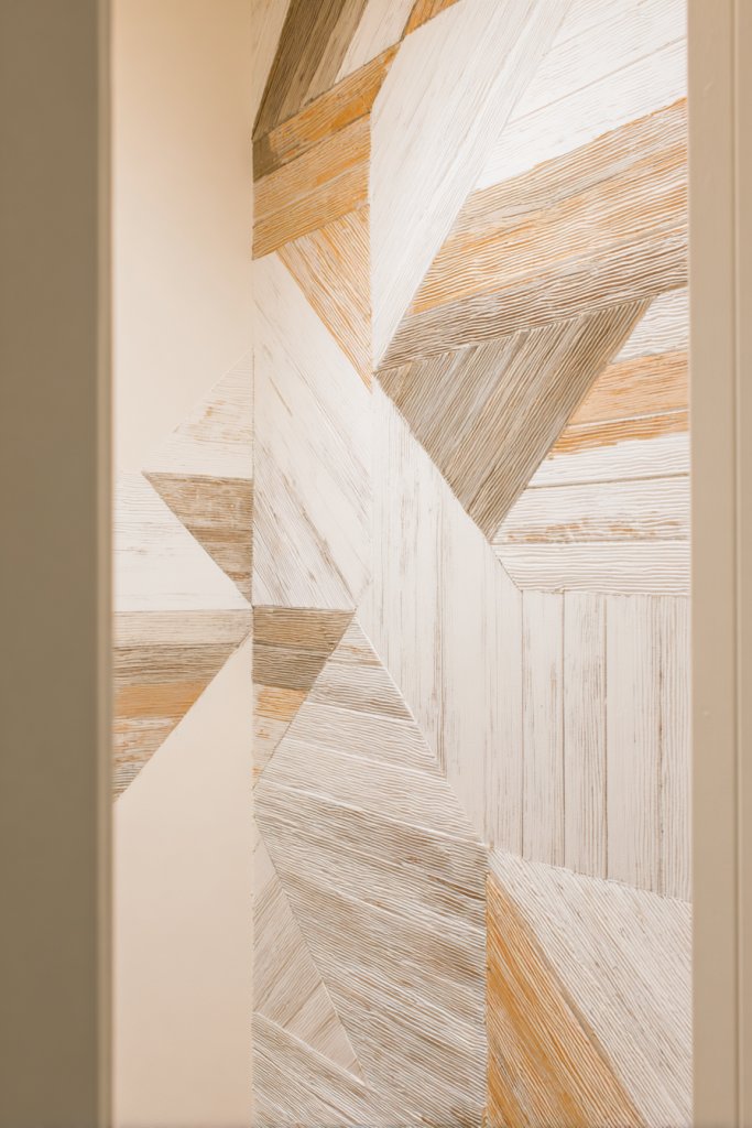 Imagine small, tapered wooden shims arranged in geometric or random patterns, creating a tactile mosaic. The natural wood tones and varied thicknesses add depth and movement. Light interacts with the uneven surfaces, casting shadows that change throughout the day. It’s a fun, eclectic look that’s full of personality.