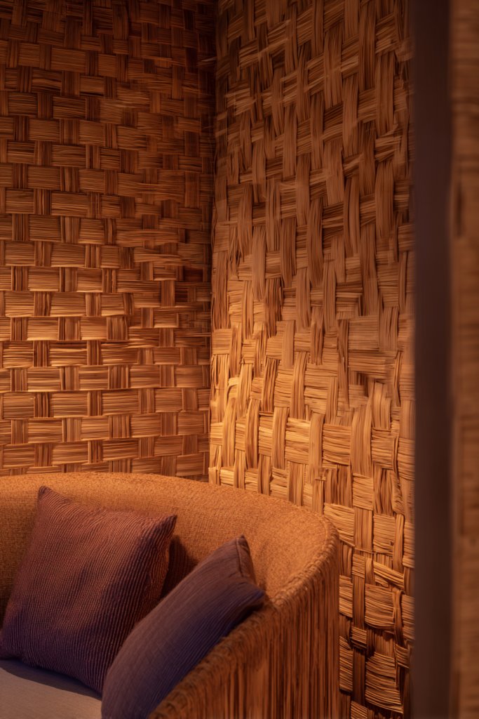 Imagine panels with intricate woven patterns in warm, earthy tones. The textured surface invites touch and adds visual interest, creating a layered, tactile effect. Light filters through the weave, casting gentle shadows that enhance the cozy, organic feel. It’s like bringing a piece of nature’s artistry indoors.